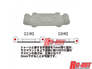 The lower suspension mounts flat surface that comes into contact with the chassis is 1mm thinner. When the suspension mount is installed upside down. the suspension pin height can be lowered by 3mm compared to the forward position.